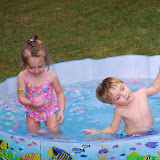 Yesterday we celebrated three birthdays: the twinkles (7/28), and my dad (8/1). It was a very special occasion, and I was happy that we got to do all three at the same time. I think my dad was especially happy that we got a bouncy castle for him. We started the day when the kids got up at the now-normal time of 7am. About this, I am not happy, since I was accustomed to the more reasonable 8am. I suppose I am now aging like my father and will eventually be rising at 4am to start my day. I'll probably have to start taking Metamucil and One A Day Senior at that time too. Anyway, I digress.