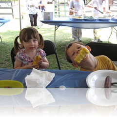 Angie’s firm had their annual customer appreciation BBQ. This time, it was at a stable just down the road in Powder Springs. There were baby chickens, as you may recall from previous posts, and a horse vaulting exhibition. Here are a few pictures of Maya and Gavin (Angie and Jason’s son) eating corn. Note: our assumption is that these two will be together some day as they love to play together.